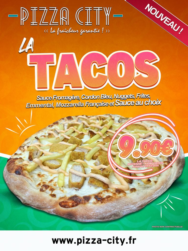 Sauce tomate, Haché au boeuf°², Sauce barbecue, Oignons, Tomates fraîches, Cheddar, Emmental, Mozzarella Française (Version Bacon Burger City disponible avec supplément Bacon°)